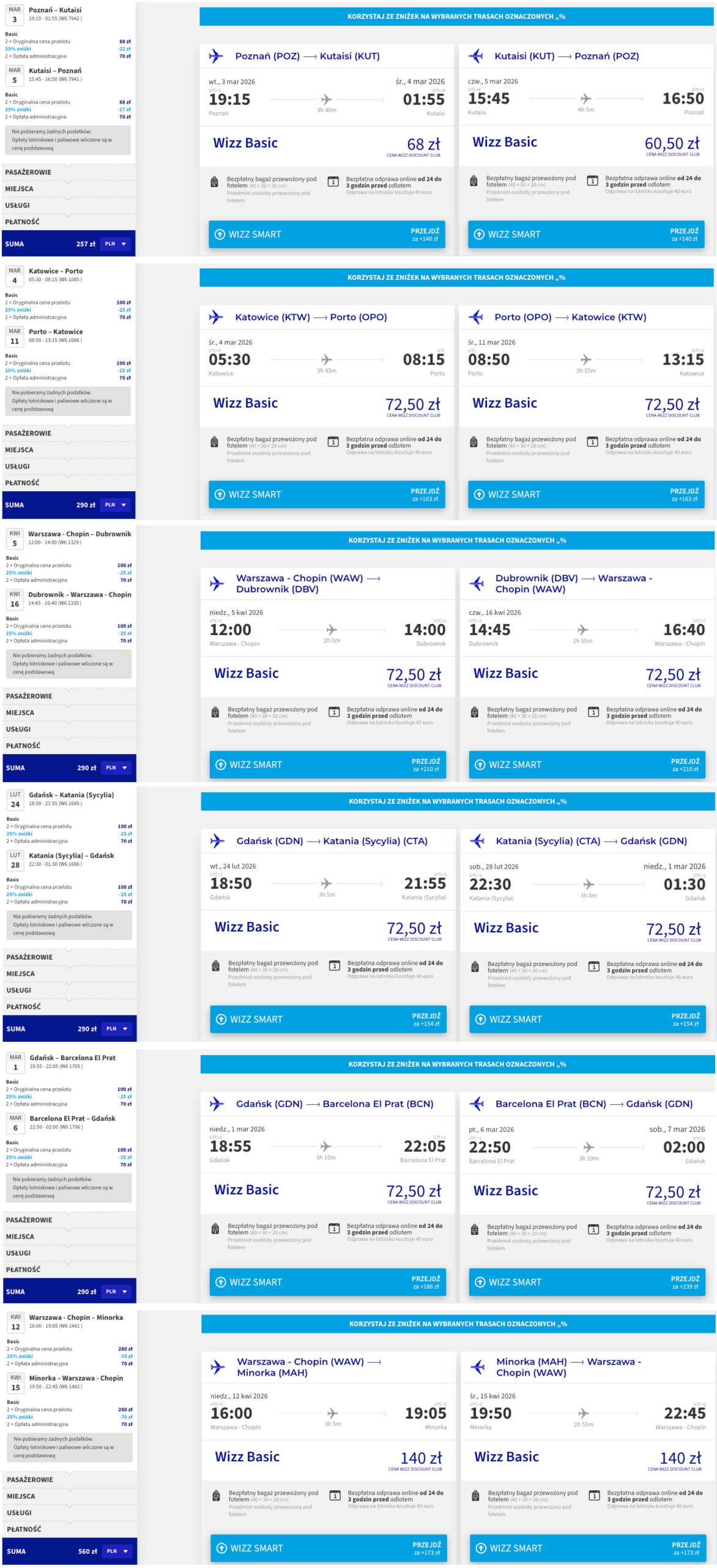 Oferta będzie aktualna dzisiaj do godz. 23:59 lub do wyczerpania puli biletów. Terminy lotów od 17 lutego do 21 maja tego roku. Oferta obowiązuje tylko wtedy, gdy rezerwacja obejmuje 2 do 4 pasażerów. To tylko przykładowe trasy, dostępnych jest ich znacznie więcej.