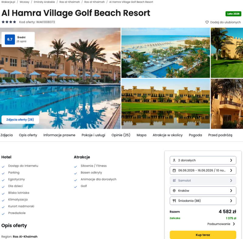 Zakwaterowanie przewidziano w stylowym obiekcie Al Hamra Village Golf Beach Resort, który wyróżnia się unikalną architekturą nawiązującą do lokalnych tradycji. Użytkownicy w swoich opiniach doceniają przede wszystkim przestronne, codziennie sprzątane pokoje oraz wyjątkowo pomocną i sympatyczną obsługę. Goście chwalą również dostęp do udogodnień sąsiedniego kompleksu, w tym prywatnej, piaszczystej plaży, do której można dotrzeć krótkim spacerem lub wygodnym transportem meleksem.
