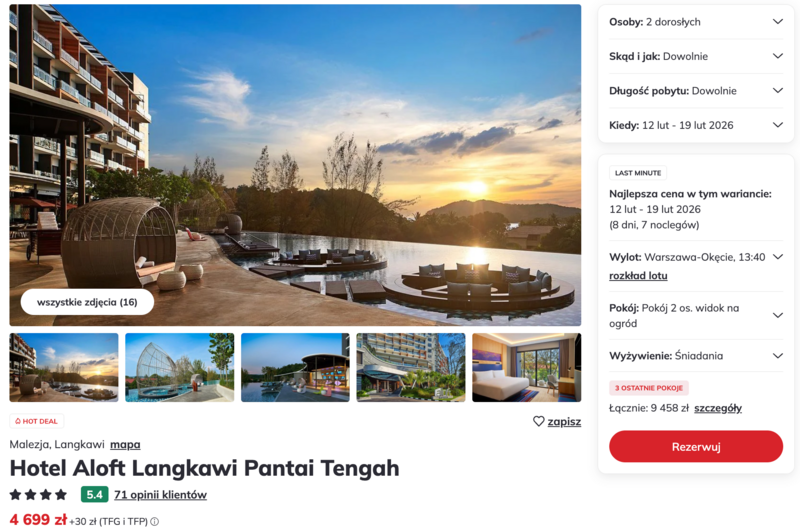 Pobyt w nowoczesnym, czterogwiazdkowym hotelu Aloft Langkawi Pantai Tengah, należącym do prestiżowej sieci Marriott, gwarantuje wypoczynek na najwyższym poziomie. Obiekt zachwyca stylowym designem, basenem typu infinity z widokiem na okolicę oraz bliskością piaszczystej plaży Pantai Tengah. Goście w swoich opiniach regularnie chwalą niezwykle wygodne łóżka, urozmaicone śniadania łączące smaki Azji i Europy oraz profesjonalną, uśmiechniętą obsługę, która dba o każdy detal.