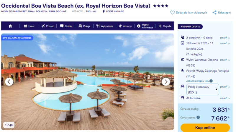 Podczas pobytu w 4* hotelu Occidental Boa Vista Beach wypoczywa się bezpośrednio przy zjawiskowej, piaszczystej plaży Praia de Chaves. Obiekt znany z wysokiego standardu obsługi, oferuje aż trzy baseny z wodą morską oraz bogaty program animacyjny, w tym wieczory taneczne i muzykę na żywo. Goście doceniają to miejsce za wyjątkową gościnność oraz przestronne pokoje z widokiem na błękitny ocean. Co najważniejsze, cała wycieczka jest dostępna w wydaniu all inclusive, co pozwala bez ograniczeń korzystać z bufetów, restauracji tematycznych oraz barów przy basenie i na plaży.