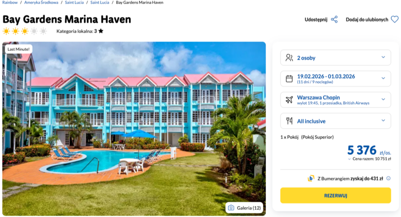 Ten kameralny wyjazd pozwala na pełen relaks w malowniczej okolicy zatoki Rodney Bay. Zakwaterowanie przewidziano w przytulnym obiekcie Bay Gardens Marina Haven, który zbiera dobre recenzje za wysoką jakość obsługi oraz domową atmosferę. Goście szczególnie chwalą wyśmienitą kuchnię oraz możliwość korzystania z infrastruktury siostrzanych hoteli, w tym z najpiękniejszej plaży w regionie – Reduit Beach. Urokliwe nabrzeże i dostęp do parku wodnego Splash Island gwarantują, że nikt nie będzie się nudził. Całość wyjazdu realizowana jest w wygodnej formule all inclusive, co zapewnia nielimitowany dostęp do lokalnych napojów i smacznych posiłków.