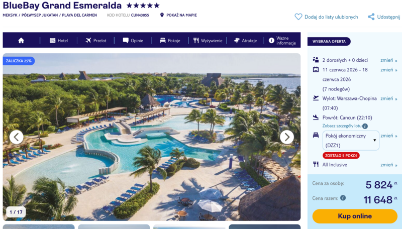 Pobyt w pięciogwiazdkowym hotelu BlueBay Grand Esmeralda gwarantuje najwyższy standard usług, co potwierdzają liczne opinie zadowolonych gości. Uczestnicy chwalą obiekt za niezwykłe położenie w sercu dżungli, gdzie poranki umilają odgłosy egzotycznych ptaków, oraz za niezwykle profesjonalną obsługę, dbającą o każdy szczegół podczas kolacji w tematycznych restauracjach. Ta wyjątkowa wycieczka jest dostępna w formule all inclusive, co pozwala na nielimitowane korzystanie z wyśmienitej kuchni meksykańskiej i międzynarodowej oraz bogatego wyboru napojów.