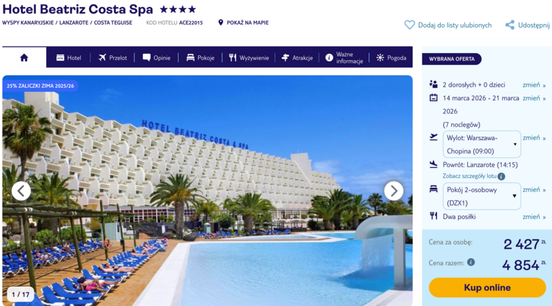 Odpoczynek zaplanowano w czterogwiazdkowym Hotelu Beatriz Costa Spa, położonym w spokojnej okolicy Costa Teguise. Obiekt zachwyca rozległym ogrodem oraz imponującym kompleksem basenowym, w tym zbiornikiem z podgrzewaną wodą. Goście chwalą smaczne i różnorodne posiłki serwowane w ramach dwóch dań dziennie oraz profesjonalne animacje, takie jak zajęcia jogi.