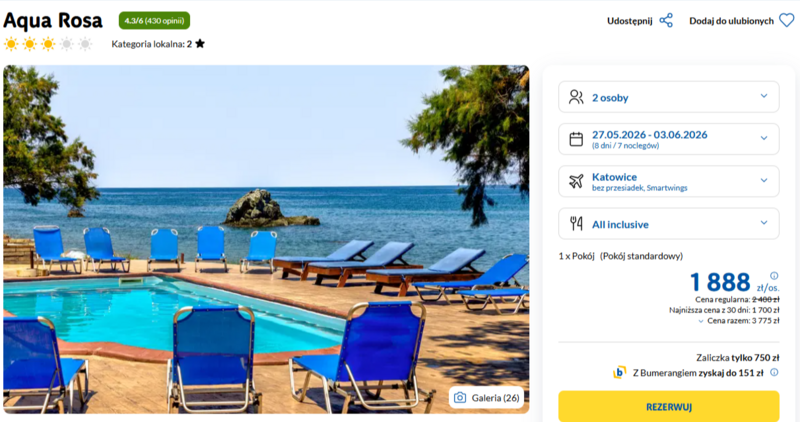Ten wyjazd do miejscowości Kokkino Nero to idealna propozycja na wiosenny relaks nad samym brzegiem morza. Zakwaterowanie w kameralnym hotelu Aqua Rosa zapewnia swobodną atmosferę oraz dostęp do niedawno wyremontowanych, schludnych pokoi. Goście szczególnie chwalą bezpośrednie sąsiedztwo plaży oraz malownicze otoczenie trasy spacerowej i ujęcia wód mineralnych. Wycieczka jest realizowana w formule all inclusive, co oznacza nielimitowane napoje, lokalne alkohole oraz smaczne posiłki serwowane w formie bufetu, w tym tradycyjne greckie specjały.