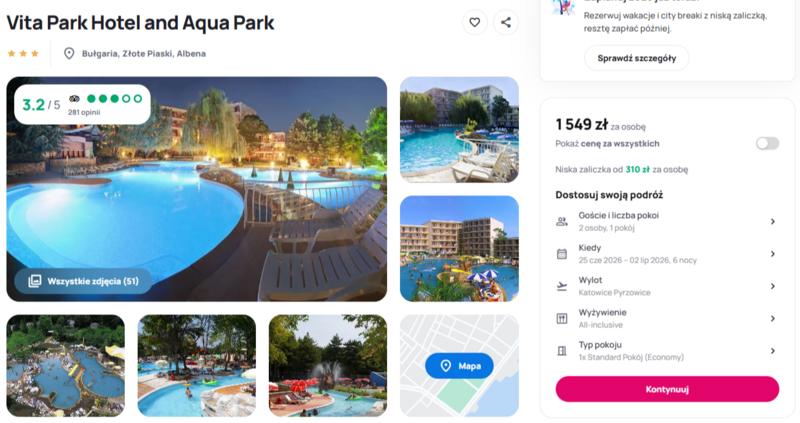 Te wyjątkowe wczasy z kwaterunkiem w hotelu Vita Park Hotel and Aqua Park pozwalają na pełen relaks, ponieważ cała oferta została przygotowana w wygodnej opcji all inclusive. Obiekt położony jest w zielonej części miejscowości Albena, niedaleko Złotych Piasków. Goście szczególnie doceniają darmowy wstęp do ogromnego parku wodnego Aquamania, co czyni to miejsce rajem dla miłośników wodnych szaleństw. Choć opinie wskazują na skromniejszy standard pokoi, użytkownicy chwalą dostępność leżaków, czyste baseny oraz bliskość piaszczystych plaż, na które można dostać się bezpłatnym transportem.