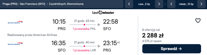 Atrakcyjne połączenie lotnicze do San Francisco jest realizowane z lotniska w Pradze. Podróż odbywa się z jedną wygodną przesiadką, co pozwala na sprawne dotarcie do zachodniego wybrzeża Stanów Zjednoczonych.