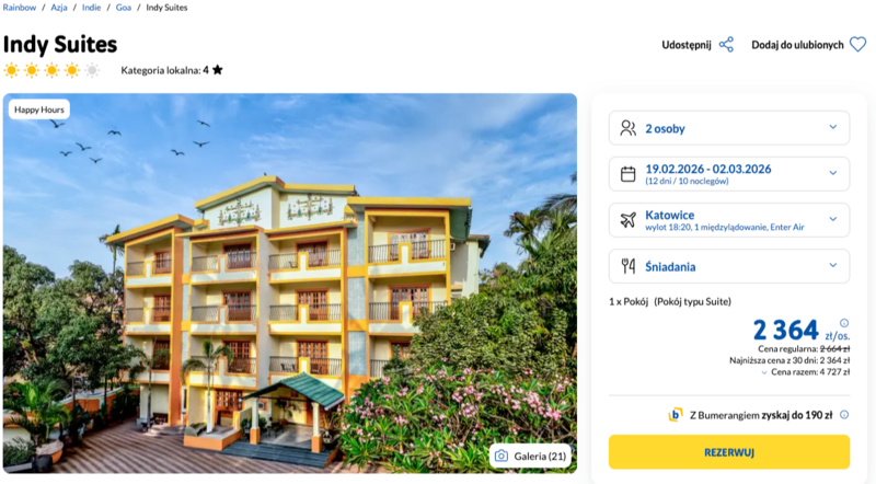 Pobyt w nowoczesnym obiekcie Indy Suites w miejscowości Candolim pozwala połączyć relaks w komfortowym pokoju typu Suite z bliskością piaszczystej plaży. Wczasowicze cenią to miejsce za spokojną atmosferę oraz pyszną kuchnię serwowaną a’ la carte, w tym dbałość o menu wegetariańskie i bezglutenowe. Do dyspozycji gości pozostaje stylowy basen, który stanowi doskonałą alternatywę dla kąpieli w oceanie, a nad bezpieczeństwem i komfortem wypoczynku czuwa polski rezydent.