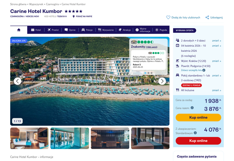 Aktualizacja: Zatoka Kotorska: Znakomicie oceniany Carine Hotel Kumbor z all inclusive od 1934 zł