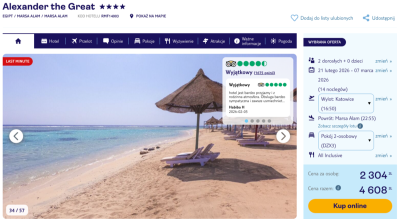 Wybór pada na czterogwiazdkowy hotel Alexander the Great, który zachwyca bezpośrednim dostępem do piaszczystej plaży oraz unikalnej rafy koralowej. Komfortowy pobyt zapewnia bogata formuła all inclusive, obejmująca zarówno smaczne posiłki w formie bufetu, jak i orzeźwiające napoje serwowane w barach przy basenie i na brzegu morza. Użytkownicy w swoich opiniach szczególnie wyróżniają rodzinną atmosferę oraz niezwykle zaangażowany zespół animatorów, który dba o rozrywkę gości w każdym wieku.