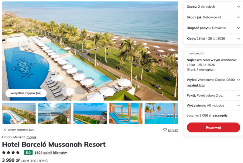 Czterogwiazdkowy Hotel Barceló Mussanah Resort, położony tuż przy malowniczej marinie w Maskacie, oferuje wypoczynek w najwyższym standardzie. Goście zachwycają się zwłaszcza basenami typu infinity, z których roztacza się kojący widok na Zatokę Omańską, oraz profesjonalną obsługą dbającą o każdy szczegół. Wycieczka realizowana jest w formule all inclusive, co pozwala bez ograniczeń delektować się urozmaiconą kuchnią międzynarodową oraz orzeźwiającymi napojami serwowanymi w hotelowych barach.