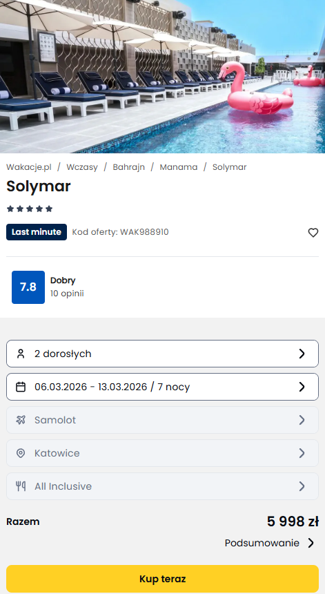 Pogoda w tym terminie jest wręcz wymarzona – słońce dopisuje, a temperatury pozwalają na swobodne zwiedzanie Manamy i błogi odpoczynek na prywatnej plaży. To także wyjątkowy czas, by poczuć autentyczną atmosferę regionu i doświadczyć legendarnej arabskiej gościnności w najlepszym wydaniu. Ta oferta to kwintesencja elegancji i egzotyki, przygotowana z myślą o parach oraz wszystkich spragnionych najwyższego standardu w atrakcyjnej cenie. Nie zwlekaj, zarezerwuj swoje miejsce już teraz i podaruj sobie wakacje, na które zasługujesz. Manama jest na wyciągnięcie ręki.