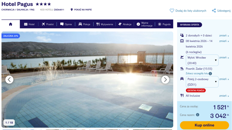Wczasy w czterogwiazdkowym hotelu Pagus na malowniczej wyspie Pag to idealna propozycja dla osób pragnących relaksu tuż przy brzegu morza. Obiekt zachwyca lokalizacją przy samej plaży oraz bliskością zabytkowego centrum miasta, co pozwala na nastrojowe spacery wąskimi uliczkami. Na miejscu korzysta się z bogatej formuły _all inclusive_, która obejmuje pełne wyżywienie w formie urozmaiconego bufetu oraz szeroki wybór napojów. Goście szczególnie chwalą smaczną kuchnię oraz profesjonalną opiekę animatorów, którzy dbają o doskonały humor dzieci i dorosłych.