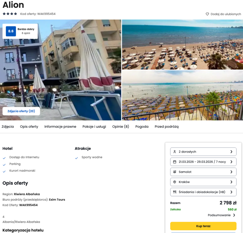 W marcu Riwiera Albańska budzi się do życia, oferując przyjemne temperatury sprzyjające spacerom wzdłuż Adriatyku oraz nielimitowane możliwości próbowania lokalnych specjałów, takich jak byrek czy tradycyjne sery. Choć w tym terminie infrastruktura zewnętrzna bywa ograniczona, bliskość klimatycznych barów i restauracji gwarantuje udany pobyt. Użytkownicy podkreślają, że hotelowa kuchnia bazuje na świeżych składnikach, co w połączeniu z rześkim, morskim powietrzem tworzy idealne warunki do regeneracji sił przed nadchodzącym sezonem letnim.