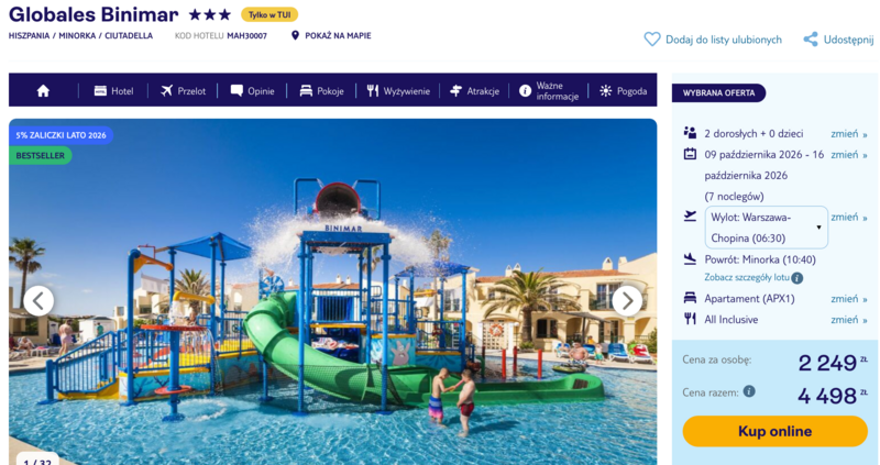 Ten wyjazd to idealna propozycja dla osób szukających relaksu w rodzinnym kompleksie Globales Binimar, położonym niedaleko urokliwej miejscowości Ciutadella. Na miejscu czekają trzy baseny, w tym strefa ze zjeżdżalniami, która jest prawdziwym rajem dla najmłodszych. Goście w swoich opiniach często chwalą piękne otoczenie hotelu, pełne zadbanej zieleni i kolorowych kwiatów, a także bliskość punktu widokowego Pont de Gil, skąd podziwiać można spektakularne zachody słońca. Cały pobyt odbywa się w komfortowej opcji all inclusive, obejmującej urozmaicone posiłki, przekąski oraz szeroki wybór napojów i lodów.
