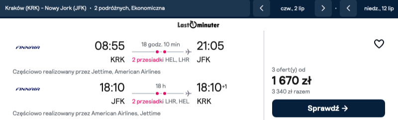 Atrakcyjne połączenie lotnicze do Nowego Jorku realizowane jest z lotniska w Krakowie. Podróż odbywa się z dwiema przesiadkami, co pozwala na znaczne obniżenie kosztów przelotu przy jednoczesnym zachowaniu standardu renomowanych linii lotniczych.