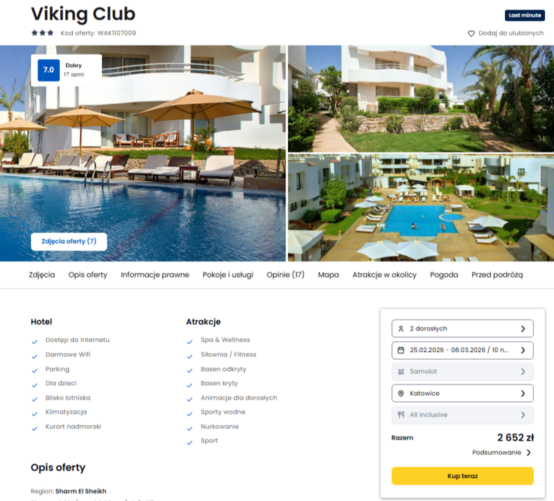 Zakwaterowanie w hotelu Viking Club pozwala na korzystanie z uroków popularnej dzielnicy Naama Bay, gdzie życie tętni do późnych godzin nocnych. Te wczasy to przede wszystkim relaks przy dwóch basenach, z których jeden jest podgrzewany, co gwarantuje komfortowe kąpiele nawet w chłodniejszych miesiącach. Na miłośników morskich przygód czeka prywatna, piaszczysta plaża, do której dowozi bezpłatny autobus. Tekst podkreśla, że wycieczka jest realizowana w wygodnej opcji all inclusive, obejmującej pełne wyżywienie w formie bufetu oraz napoje i lokalne alkohole serwowane w kilku hotelowych barach.