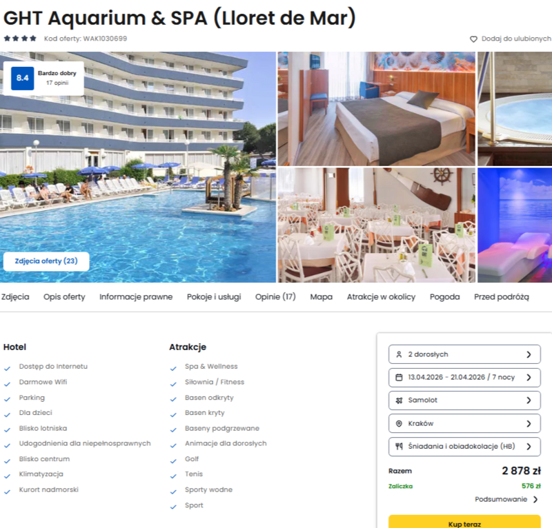 Wczasy w Lloret de Mar pozwalają na relaks w renomowanym, czterogwiazdkowym hotelu GHT Aquarium & SPA, który cieszy się bardzo dobrymi opiniami gości. Użytkownicy szczególnie chwalą wysoką jakość obsługi hotelowej, nienaganną czystość w pokojach oraz obfite i różnorodne posiłki serwowane w formie bufetu. Obiekt oferuje dostęp do nowoczesnej strefy odnowy biologicznej, w tym podgrzewanego basenu krytego, co stanowi doskonałą alternatywę dla kąpieli morskich.