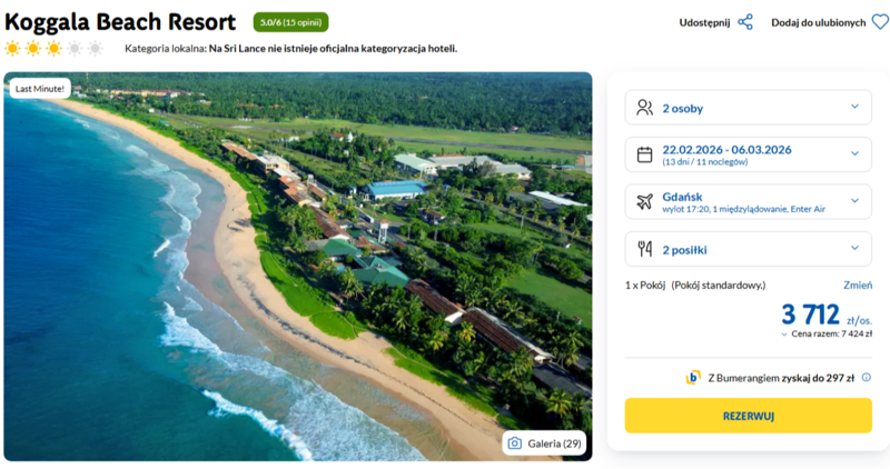 Pobyt w hotelu Koggala Beach Resort to gwarancja relaksu w malowniczym otoczeniu południowego wybrzeża Sri Lanki. Goście szczególnie chwalą sobie błękitny ocean widoczny niemal z każdego balkonu oraz wyjątkowo uprzejmą obsługę, która dba o rodzinną atmosferę. Podróżni w swoich opiniach często wspominają o wyśmienitej lokalnej kuchni serwowanej podczas śniadań i obiadokolacji oraz o czystym basenie, który jest idealną alternatywą dla kąpieli w falach.