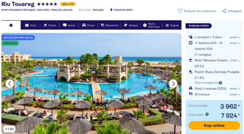 To idealna okazja, aby zaznać luksusu w pięciogwiazdkowym hotelu Riu Touareg, który zachwyca rozległym ogrodem i krystalicznymi basenami. Cały pobyt zorganizowano w wygodnej formule all inclusive, co pozwala bez ograniczeń delektować się urozmaiconą kuchnią, od świeżych owoców morza po wyśmienite lokalne specjały. Goście w swoich opiniach szczególnie wychwalają szerokie, piaszczyste plaże oraz profesjonalną obsługę, która dba o każdy szczegół wypoczynku.
