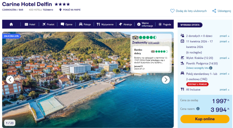 Wczasy w 4* Carine Hotel Delfin to gwarancja relaksu w wysokim standardzie. Goście szczególnie zachwalają nowoczesne, odnowione i niezwykle czyste pokoje, z których okien rozpościera się kojący widok na Zatokę Kotorską. Wycieczka jest oferowana w opcji all inclusive, co pozwala bez ograniczeń cieszyć się smacznym i urozmaiconym wyżywieniem, obejmującym świeże ryby, lokalne specjały oraz szeroki wybór owoców i napojów. Na miejscu do dyspozycji pozostaje prywatna plaża z bezpłatnym serwisem oraz podgrzewany basen, idealny na chłodniejsze wieczory.