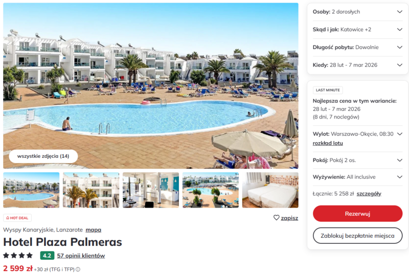 Na spragnionych relaksu czeka czterogwiazdkowy Hotel Plaza Palmeras, położony w tętniącym życiem kurorcie Puerto del Carmen. Obiekt zachwyca gości przede wszystkim wyśmienitą kuchnią oraz serdeczną obsługą, która dba o każdy szczegół pobytu. Wycieczka jest oferowana w opcji all inclusive, co pozwala bez ograniczeń delektować się lokalnymi przysmakami, owocami morza oraz szerokim wyborem koktajli przy basenie o nieregularnym kształcie.