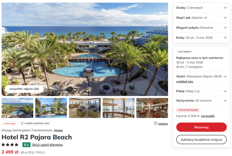 Pobyt w 4* hotelu R2 Pajara Beach zapewnia gościom unikalną atmosferę oraz bezpośredni dostęp do urokliwych, piaszczystych zatoczek. Obiekt wyróżnia się imponującą architekturą z panoramicznymi windami i kaskadami wody, a podróżni w swoich opiniach zachwalają przestronne pokoje oraz profesjonalny serwis. Wycieczka realizowana jest w wygodnej opcji all inclusive, dzięki której można bez ograniczeń korzystać z bogatego bufetu dań międzynarodowych oraz różnorodnych napojów w barach przy basenie i w lobby.