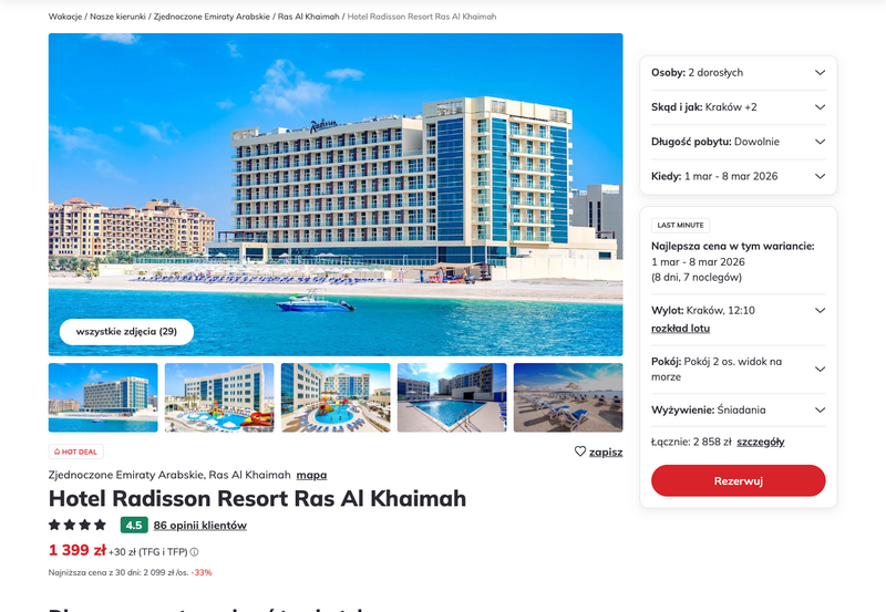 To idealny czas na wypoczynek w Zjednoczonych Emiratach Arabskich, gdy temperatura powietrza w dzień osiąga przyjemne 31 stopni Celsjusza, a woda w zatoce zachęca do kąpieli. Zakwaterowanie odbywa się w eleganckim, nowo wybudowanym hotelu Radisson Resort położonym na malowniczej, sztucznej wyspie Marjan w Ras al-Chajma. Goście mają do dyspozycji prywatną plażę z jasnym piaskiem oraz komfortowe, funkcjonalne pokoje z widokiem na turkusową toń morza.