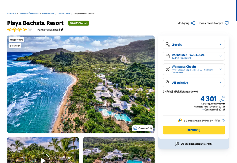 Te wyjątkowe wczasy pozwalają w pełni zanurzyć się w radosnej atmosferze Karaibów, korzystając z uroków hotelu Playa Bachata Resort. Obiekt, malowniczo położony w zatoce Maimón, otoczony jest bujnym, tropikalnym ogrodem, który zapewnia kojący cień w upalne dni. Goście chwalą to miejsce za niezwykle szeroką, piaszczystą plażę oraz bogaty program animacyjny, obejmujący wieczorne występy i zajęcia sportowe. Wycieczka odbywa się w formule all inclusive, co gwarantuje nielimitowany dostęp do lokalnych przysmaków w restauracjach bufetowych, orzeźwiających drinków w barach oraz pysznej kawy serwowanej przy basenach.