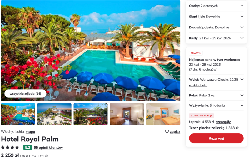 Ten urokliwy zakątek Włoch zachwyca turystów malowniczym położeniem na wzgórzu, skąd rozpościera się zapierający dech widok na zatokę Citara. Zakwaterowanie w czterogwiazdkowym Hotelu Royal Palm pozwala poczuć klimat śródziemnomorskiej willi otoczonej gajami oliwnymi. Goście szczególnie doceniają dostęp do leczniczych basenów termalnych oraz bliskość piaszczystej plaży. Użytkownicy w swoich opiniach wspominają o niezwykle życzliwej obsłudze oraz czystych i przestronnych pokojach z tarasami, które stanowią idealne miejsce na poranną kawę.