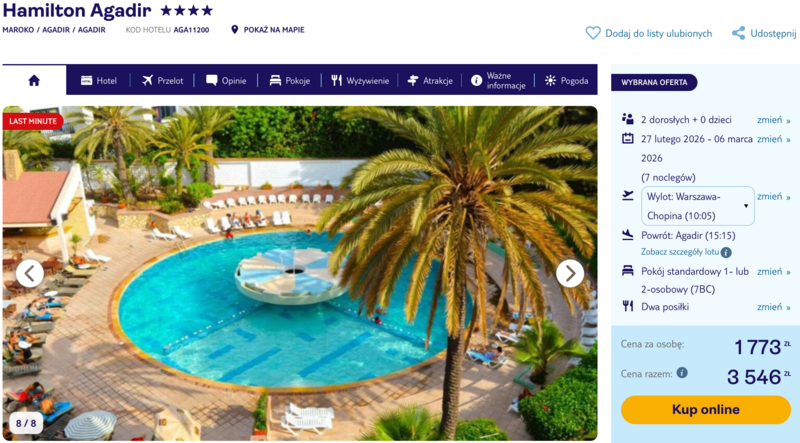 Pobyt zaplanowano w czterogwiazdkowym hotelu Hamilton Agadir, który przeszedł renowację w dwa tysiące dwudziestym drugim roku. Obiekt cieszy się dobrymi opiniami dzięki położeniu w samym centrum miasta, co pozwala na swobodne korzystanie z lokalnych rozrywek i kawiarni. Goście doceniają bliskość szerokiej, piaszczystej plaży, oddalonej o krótki spacer, oraz dostęp do basenów, w tym jednego krytego i drugiego na świeżym powietrzu. Na miejscu zapewnione są dwa posiłki dziennie, co stanowi świetną bazę do kulinarnych odkryć w Maroku.