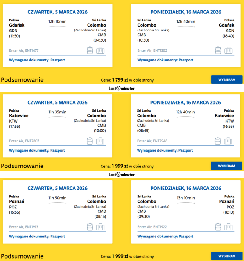 Wyjątkowa okazja przelotu do Kolombo z Gdańska, Katowic i Poznania.. To atrakcyjne połączenie lotnicze pozwala na sprawne dotarcie do egzotycznej Azji, otwierając drzwi do odkrywania uroków tej malowniczej wyspy.