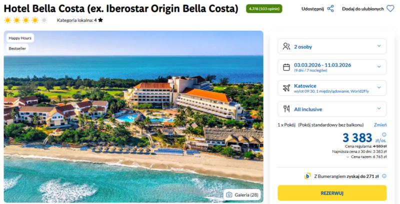 To idealny moment na rajskie wczasy w słynnym kurorcie Varadero, gdzie turkusowa woda obmywa piaszczyste wybrzeże. Zakwaterowanie w czterogwiazdkowym Hotelu Bella Costa zapewnia dostęp do rozległego ogrodu i bogatej infrastruktury sportowej, w tym siatkówki plażowej czy tenisa stołowego. Całość pobytu przygotowano w komfortowej formule **all inclusive**, co oznacza nielimitowany dostęp do lokalnych napojów, smacznego bufetu oraz przekąsek w ciągu całego dnia. Goście szczególnie chwalą hotel za wyjątkowe położenie przy samej plaży oraz niezwykle przyjazną obsługę, która dba o radosną atmosferę.