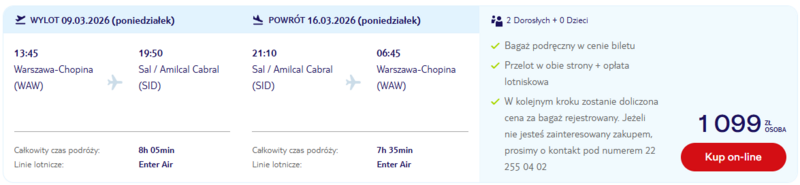 Te atrakcyjne przeloty w obie strony realizowane są przez linie lotnicze Enter Air, a czas podróży wynosi około ośmiu godzin. W cenie biletu uwzględniono bagaż podręczny, co pozwala na sprawne spakowanie najpotrzebniejszych rzeczy na wiosenny urlop. Podróż rozpoczyna się w godzinach popołudniowych, dzięki czemu na miejscu ląduje się jeszcze tego samego dnia, zyskując czas na aklimatyzację w egzotycznym otoczeniu.