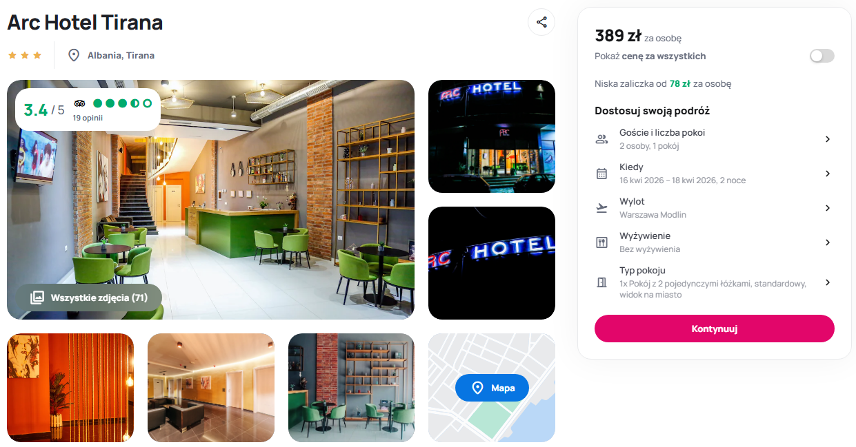 City break w Tiranie pozwalają poczuć wyjątkowy klimat stolicy, która tętni życiem i kolorami. Zakwaterowanie w 3* Arc Hotel Tirana zapewnia komfortową bazę wypadową do zwiedzania najważniejszych punktów miasta, takich jak plac Skanderbega czy Narodowe Muzeum Historyczne. Goście doceniają obiekt za czystość, niezwykle ciepłe powitanie ze strony personelu oraz doskonały stosunek jakości do ceny, co czyni go świetnym wyborem na budżetowy city break.