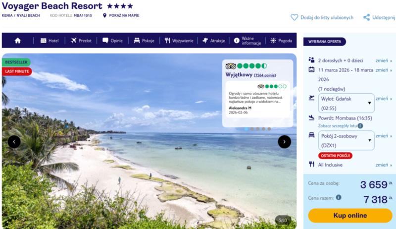 Odpoczynek odbywa się w czterogwiazdkowym hotelu Voyager Beach Resort, położonym bezpośrednio przy piaszczystej plaży Nyali. Obiekt zachwyca rozległym ogrodem i trzema basenami, z których jeden dedykowany jest osobom szukającym ciszy i relaksu z widokiem na ocean. Goście podkreślają w swoich opiniach niezwykłą serdeczność obsługi oraz bogaty program animacyjny, w tym wieczory z muzyką na żywo i tańcami Hakuna Matata. Cały pobyt realizowany jest w formule all inclusive, co pozwala bez ograniczeń delektować się zróżnicowaną kuchnią i świeżymi kokosami.