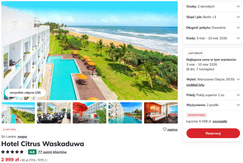 W opiniach wczasowiczów często pojawiają się zachwyty nad wyśmienitą lokalną kuchnią oraz niezwykle uprzejmą obsługą, która dba o każdy detal pobytu. Choć okolica sprzyja wyciszeniu i spokojnej regeneracji, miłośnicy wrażeń mogą skorzystać z luksusowych zabiegów w hotelowym spa. Dla spragnionych przygód region oferuje niezapomniane wyprawy do kolonialnego fortu w Galle czy na malownicze plantacje słynnej cejlońskiej herbaty. To wymarzona okazja na przedwiośnie, by naładować baterie w pełnym słońcu i otoczeniu egzotycznej przyrody.