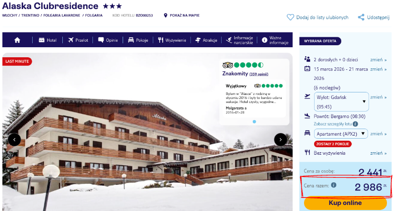 Zakwaterowanie przewidziano w trzygwiazdkowym obiekcie Alaska Clubresidence, który cieszy się bardzo dobrymi opiniami wśród odwiedzających. Goście podkreślają wyjątkowo udaną atmosferę, czystość oraz świetne wyposażenie apartamentów. Szczególnym uznaniem cieszy się strefa relaksu z krytym basenem i sauną fińską, stanowiąca doskonałe dopełnienie aktywnego dnia. Rodziny z dziećmi chwalą profesjonalne animacje oraz bogato wyposażony pokój zabaw, co czyni to miejsce przyjaznym dla każdego typu podróżnika.