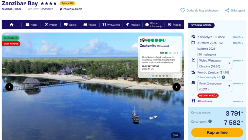 Wczasy w obiekcie Zanzibar Bay to okazja do zamieszkania w kameralnym hotelu położonym bezpośrednio przy piaszczystej plaży w okolicach miejscowości Uroa. Goście szczególnie doceniają tutejszą strefę relaksu z trzema basenami oraz wyjątkowy pomost z barem, który pozwala podziwiać ocean o każdej porze dnia. Wycieczka jest dostępna w formule all inclusive, co zapewnia pełny komfort i dostęp do zróżnicowanych posiłków, w tym świeżych ryb oraz lokalnych owoców. Nowoczesne pokoje z afrykańskimi akcentami oraz pomocna obsługa sprawiają, że pobyt upływa w wyjątkowo przyjaznej atmosferze.