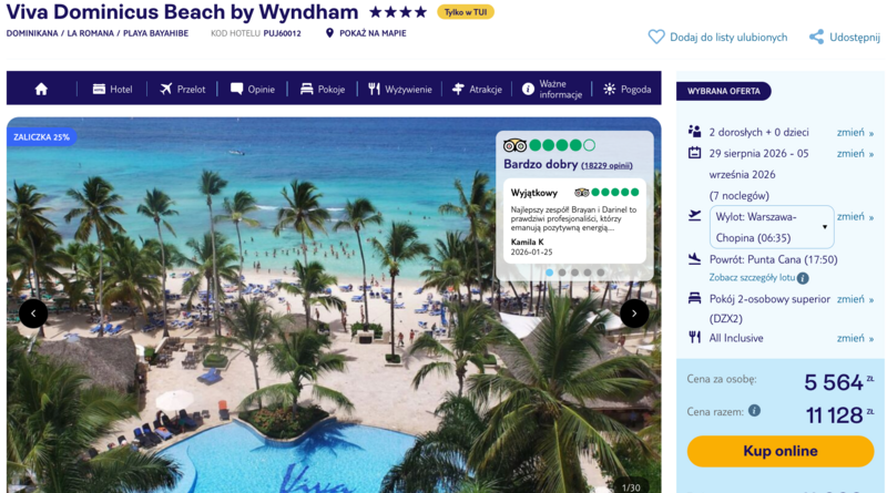 Ten wyjazd do hotelu Viva Dominicus Beach by Wyndham to gwarancja relaksu w otoczeniu palm i błękitnych wód Karaibów. Obiekt, położony tuż przy piaszczystej plaży w pobliżu miejscowości Bajahibe, jest niezwykle wysoko oceniany przez gości. Użytkownicy w swoich opiniach zachwalają przede wszystkim cudowną atmosferę, profesjonalny zespół animatorów oraz fakt, że ta wycieczka jest w opcji all inclusive. Dzięki temu można bez ograniczeń korzystać z bogatej oferty gastronomicznej, w tym z pysznej, świeżo wypiekanej pizzy dostępnej niemal przez całą dobę oraz sześciu różnorodnych barów.