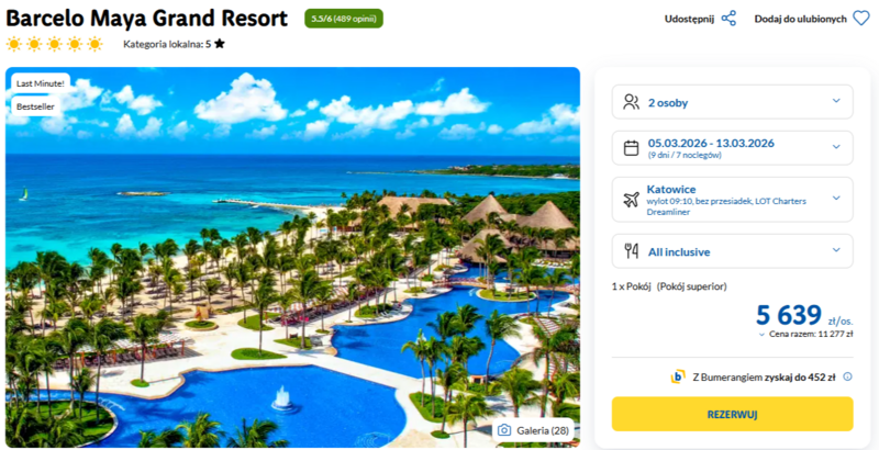 Goście zatrzymają się w prestiżowym, pięciogwiazdkowym obiekcie Barcelo Maya Grand Resort, położonym bezpośrednio przy rajskiej plaży z białym piaskiem i turkusową wodą. Wycieczka jest realizowana w formule all inclusive, co gwarantuje nielimitowany dostęp do lokalnych napojów, bogatych bufetów oraz restauracji tematycznych. Użytkownicy w swoich opiniach zachwycają się niesamowitą infrastrukturą sportową, w tym możliwością nauki surfingu, nurkowania czy gry w minigolfa. Często wspominana jest także obecność egzotycznych zwierząt, jak legwany i ostronosy, które swobodnie przechadzają się po zadbanym, zielonym terenie kompleksu.