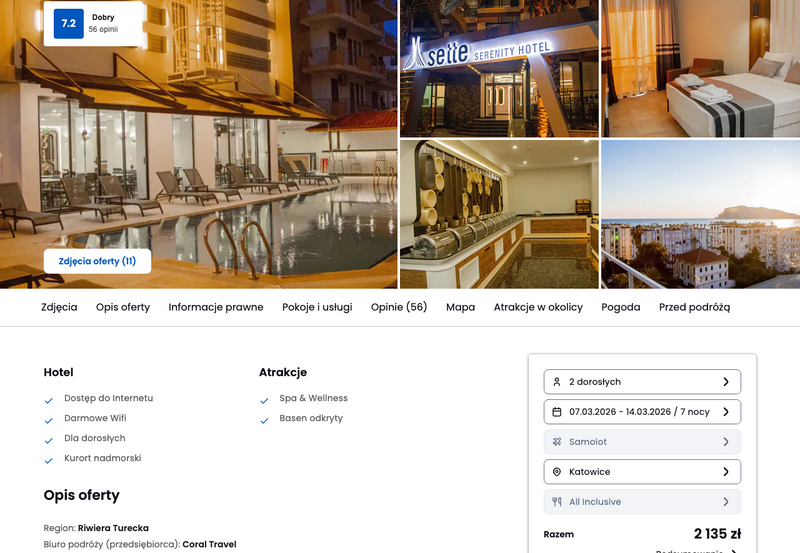 Wybór pada na hotel Sette Serenity, który cieszy się dobrymi opiniami dzięki nowoczesnym pokojom i miłej obsłudze. Obiekt gwarantuje spokój i relaksującą atmosferę. Na miejscu serwowana jest smaczna kuchnia, a cała wycieczka odbywa się w formule all inclusive, co pozwala na pełną swobodę bez dodatkowych kosztów za posiłki i napoje. Goście doceniają bliskość morza oraz łatwy dostęp do tętniącego życiem miasta.