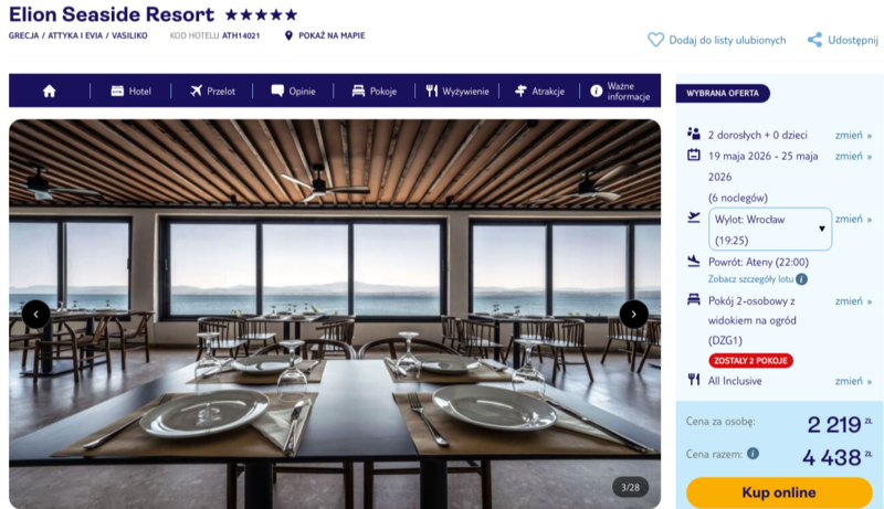 Podczas pobytu czas płynie niezwykle przyjemnie dzięki bogatemu programowi rozrywek. Do dyspozycji oddano strefę wellness, nowoczesną siłownię oraz miniklub dla najmłodszych wczasowiczów. Całość wyjazdu realizowana jest w wygodnej formule all inclusive, która obejmuje pełne wyżywienie w formie bufetu z daniami kuchni międzynarodowej oraz lokalne napoje. Maj w tym regionie Grecji to spora szansa na idealną pogodę z temperaturami przekraczającymi 24 stopnie Celsjusza, co sprzyja zarówno kąpielom, jak i zwiedzaniu okolicznych zabytków.