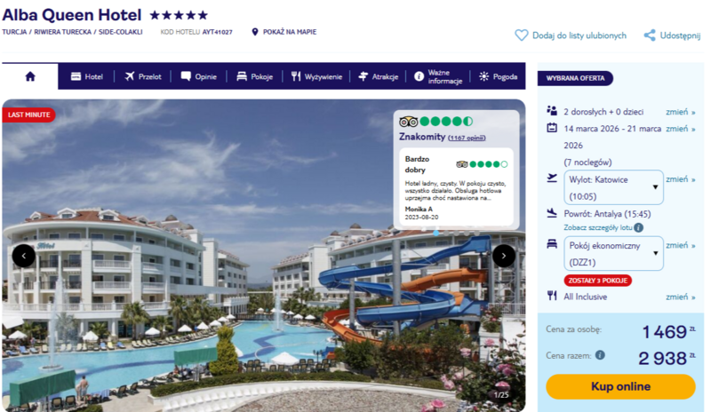 Zakwaterowanie zaplanowano w prestiżowym, pięciogwiazdkowym Alba Queen Hotel, który słynie z bezpośredniego dostępu do piaszczystej plaży oraz rozbudowanej strefy basenowej ze zjeżdżalniami. Goście podkreślają w swoich opiniach wysoki poziom czystości oraz profesjonalizm zespołu animatorów, który dba o rozrywkę zarówno dorosłych, jak i dzieci. Cały pobyt odbywa się w formule all inclusive, co gwarantuje nielimitowany dostęp do smacznych posiłków kuchni międzynarodowej oraz orzeźwiających napojów bezalkoholowych i lokalnych trunków.
