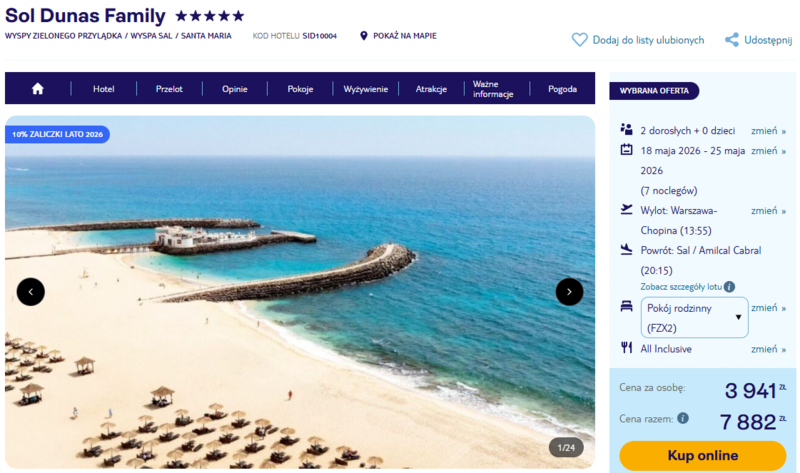 Pobyt w pięciogwiazdkowym hotelu Sol Dunas Family zapewnia najwyższy standard wypoczynku, co potwierdzają liczne pozytywne opinie zadowolonych gości. Użytkownicy szczególnie chwalą rozbudowany aquapark ze zjeżdżalniami oraz bogaty program animacyjny, który nie pozwala na nudę ani dzieciom, ani dorosłym. Obiekt oferuje aż trzy baseny zewnętrzne, nowoczesną strefę spa oraz bezpośredni dostęp do piaszczystego wybrzeża Oceanu Atlantyckiego. Całość wyjazdu realizowana jest w wygodnej formule all inclusive, obejmującej pełne wyżywienie w formie bufetu, różnorodne przekąski oraz szeroki wybór napojów.