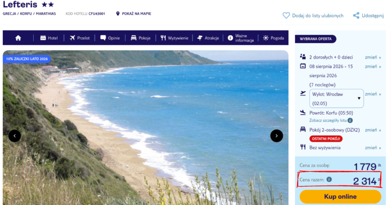Za dodatkową opłatą zakwaterowanie ze śniadaniami. Najtańsze terminy na lipiec i sierpień tego roku.