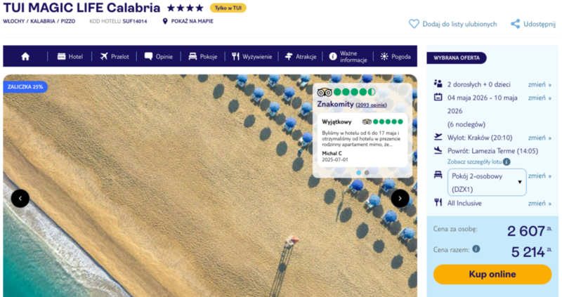 Ten czterogwiazdkowy obiekt w Kalabrii zachwyca położeniem w sercu bujnego, pachnącego ogrodu, przez który malownicza ścieżka prowadzi wprost na szeroką, piaszczysto-żwirową plażę. Goście szczególnie doceniają bogatą ofertę kulinarną, podkreślając, że dopiero tutaj można poznać autentyczne smaki Italii. Wyjazd odbywa się w formule all inclusive, co oznacza nielimitowany dostęp do wyśmienitych makaronów z owocami morza, rzemieślniczej pizzy oraz orzeźwiających koktajli serwowanych między innymi w barze przy samym brzegu morza.