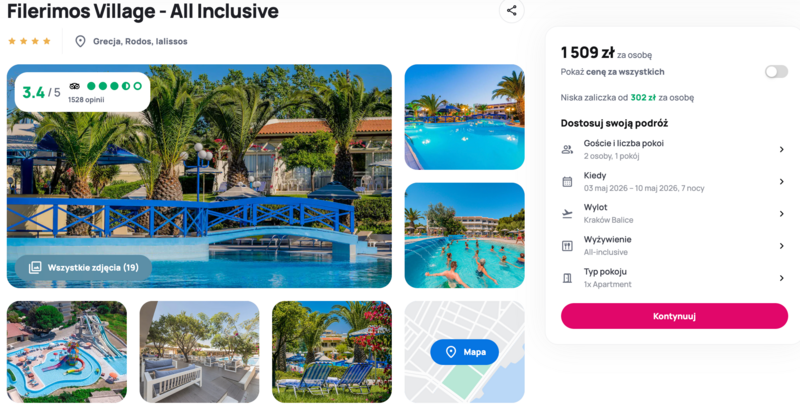 Wypoczynek w Grecji zaplanowano w komfortowym hotelu Filerimos Village, który otoczony jest rozległym, śródziemnomorskim ogrodem. Goście cenią ten obiekt przede wszystkim za wspaniały park wodny ze zjeżdżalniami oraz leniwą rzeką, co czyni go rajem dla rodzin. Cały pobyt jest realizowany **w opcji all inclusive**, co gwarantuje pełne wyżywienie w formie bufetu oraz szeroki wybór napojów i przekąsek bez dodatkowych kosztów. Pokoje są klimatyzowane i posiadają balkony, a miłośnicy morskich kąpieli dotrą do żwirowej plaży w miejscowości Ialisos w zaledwie kilka minut spacerem.