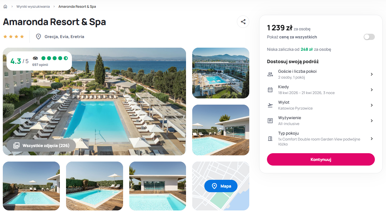Nowoczesny 4* hotel Amaronda Resort & Spa, położony bezpośrednio przy prywatnej plaży z łagodnym zejściem do morza, gwarantuje wypoczynek w najwyższym standardzie. Goście doceniają obiekt za wyjątkową dbałość o czystość, elegancki wystrój oraz profesjonalną obsługę, o czym świadczą wysokie oceny dotychczasowych podróżnych. Podkreśla się, że wycieczka jest realizowana w formule all inclusive, co zapewnia pełne wyżywienie w formie bufetu oraz nielimitowany dostęp do lokalnych napojów i przekąsek.