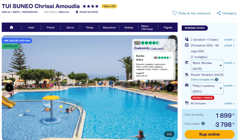 Ten urokliwy wyjazd pozwala odkryć piękno największej greckiej wyspy, zatrzymując się w czterogwiazdkowym hotelu TUI SUNEO Chrissi Amoudia. Obiekt, zbudowany w tradycyjnym kreteńskim stylu, przyciąga gości odnowionymi, estetycznymi wnętrzami lobby oraz restauracją z widokowym tarasem. Użytkownicy w swoich opiniach szczególnie chwalą urozmaicone posiłki oraz serdeczną atmosferę budowaną przez zespół animatorów. Całość wypoczynku odbywa się w wygodnej formule all inclusive, co gwarantuje pełen dostęp do lokalnych przysmaków, napojów oraz przekąsek serwowanych w ciągu dnia.