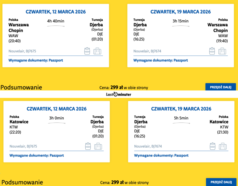 Djerba, Katowice, Warszawa